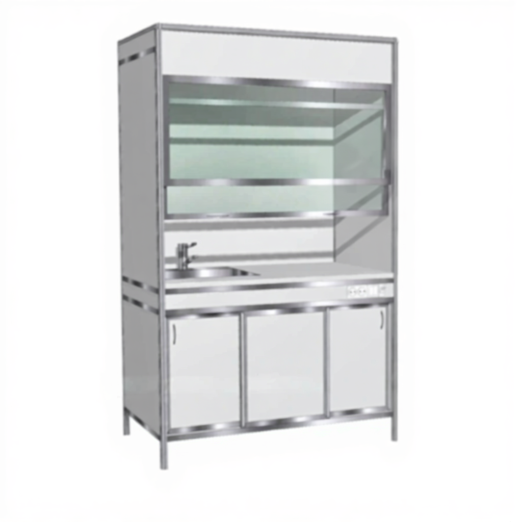 • Наполнение: светильник, вентилятор вытяжной, фланец 100 мм для соединения шкафа к вытяжной вентиляции. Дверка - защитный экран, оргстекло в алюминиевой рамке.