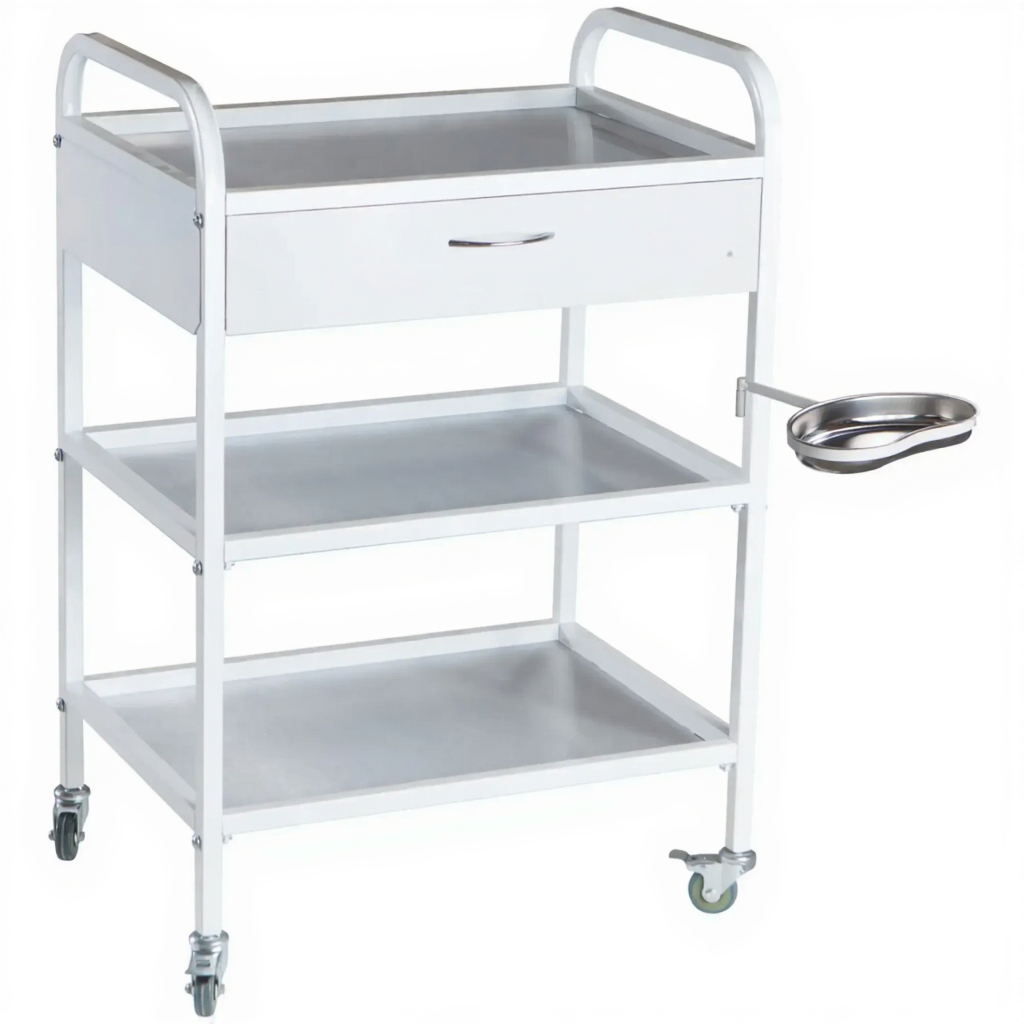 - Почкообразный лоток в комплекте — из нержавеющей стали на поворотном кронштейне, что расширяет функциональность стола в процедурных кабинетах.