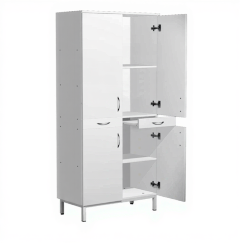 - Функциональная трехсекционная конструкция — верхний и нижний отделы для хранения реактивов, средний отдел с выдвижными полками для документации и записей.
