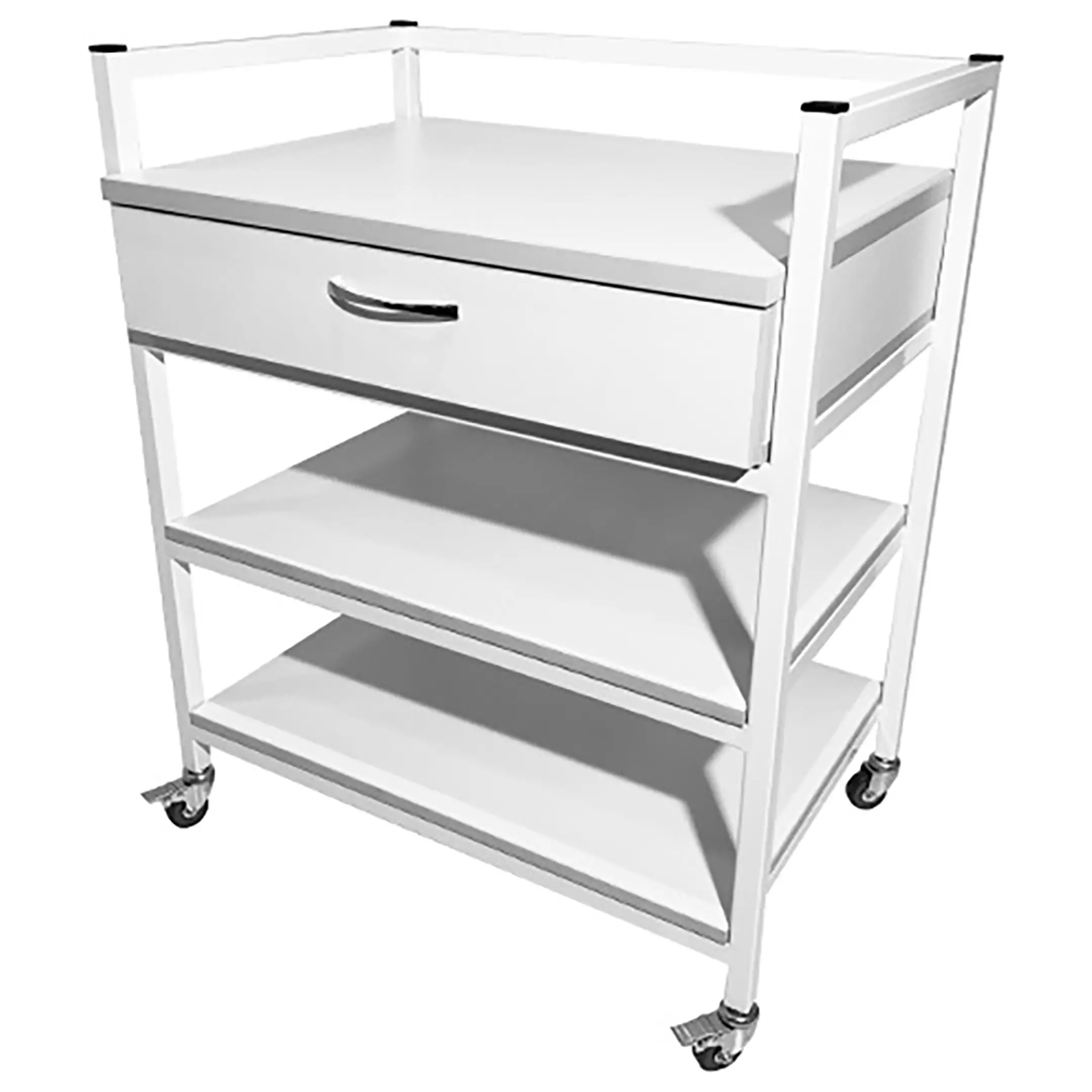 Стол лабораторный мобильный СЛм 17.001 (белый) представляет собой идеальное решение для временного размещения и удобного перемещения различных инструментов, предметов или приборов в медицинских учреждениях и лабораториях. Модель оснащена выдвижным ящиком, двумя полками и установлена на колесные опоры. Каркас выполнен из стального профиля, столешница из ЛДСП толщиной 16 мм.