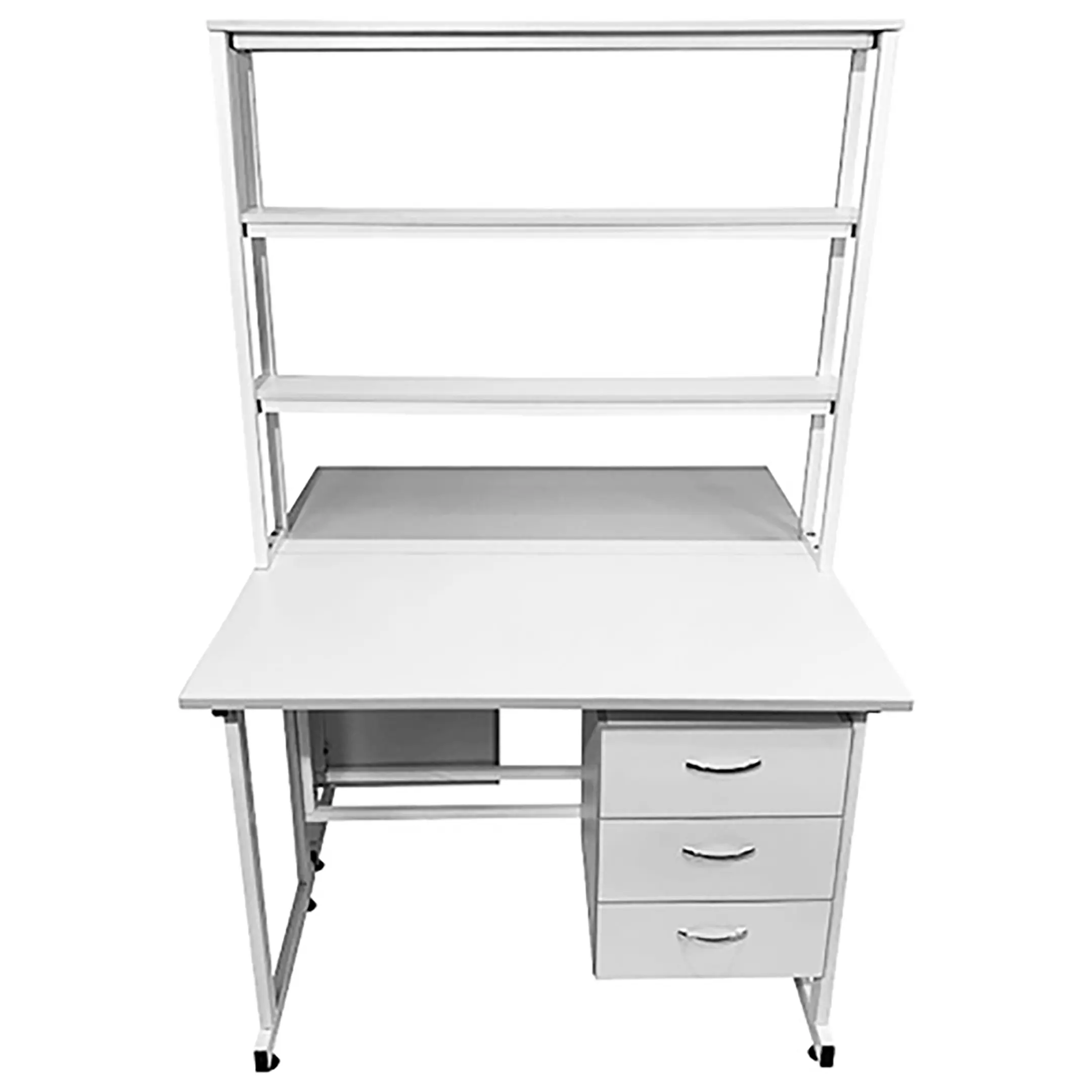 Стол лабораторный островной с надстройкой Сло 22.021 (белый) — это идеальное решение для организации двух рабочих мест в лабораториях или медицинских учреждениях. Модель оснащена двумя рабочими местами, каждое с подвесной тумбой с тремя выдвижными ящиками, и центральной надстройкой с тремя полками. Каркас выполнен из стального профиля, столешницы из ЛДСП толщиной 22 мм.