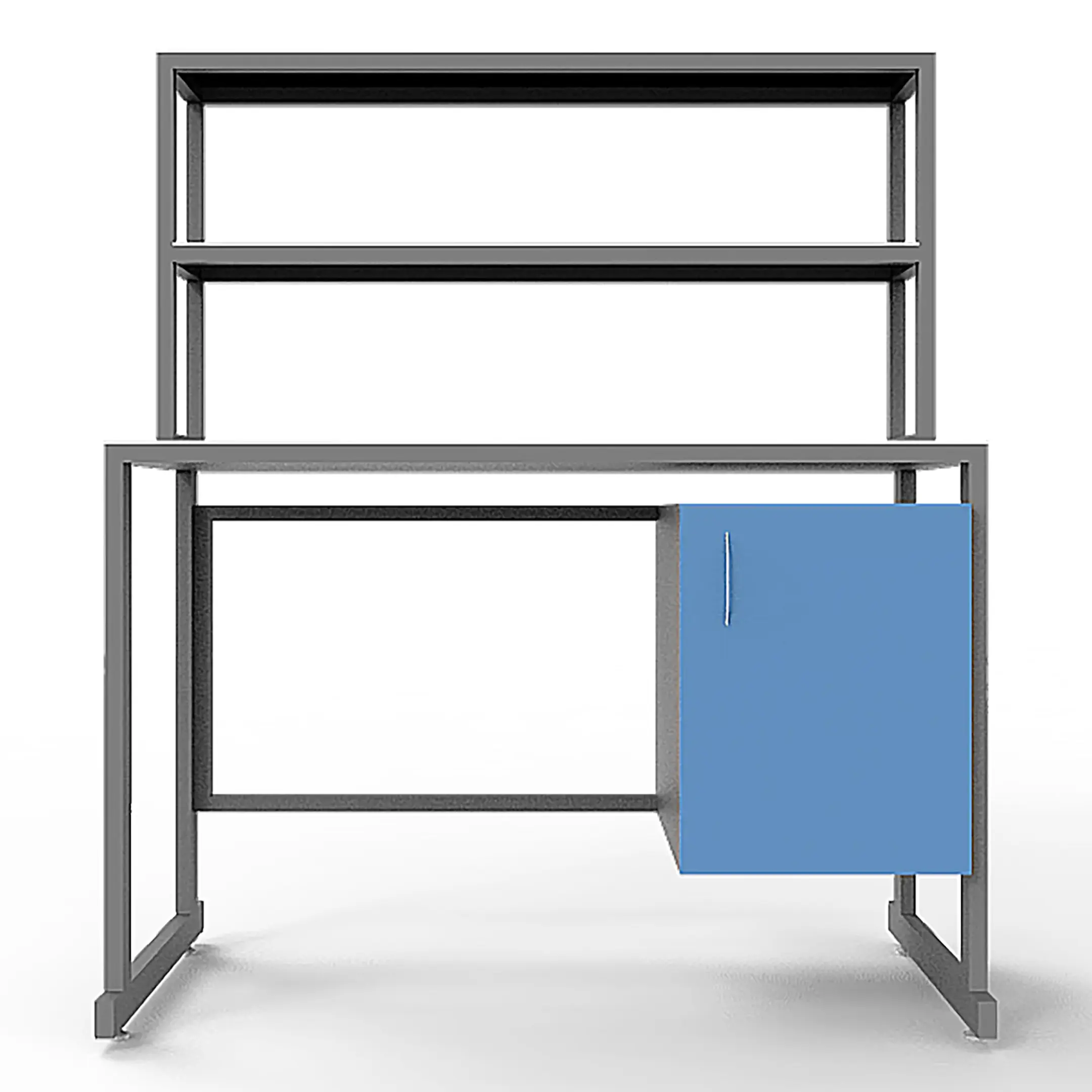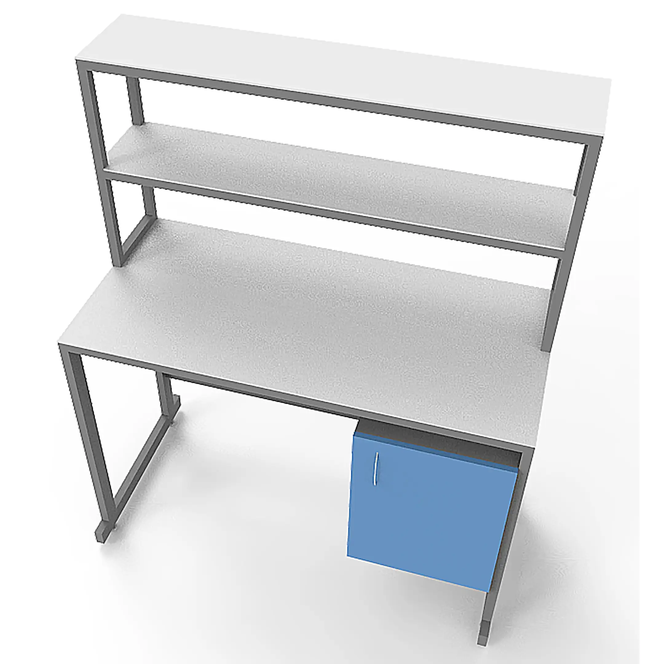 - Удобная система хранения — тумба под столешницей с распашной дверцей и надстройка с двумя полками для хранения материалов и оборудования.