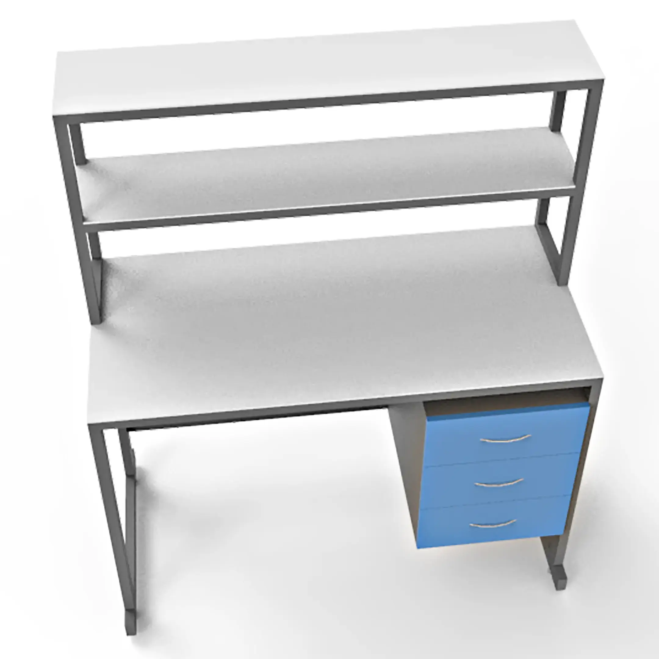 - Удобная система хранения — тумба под столешницей с тремя выдвижными ящиками и надстройка с двумя полками для хранения материалов и инструментов.