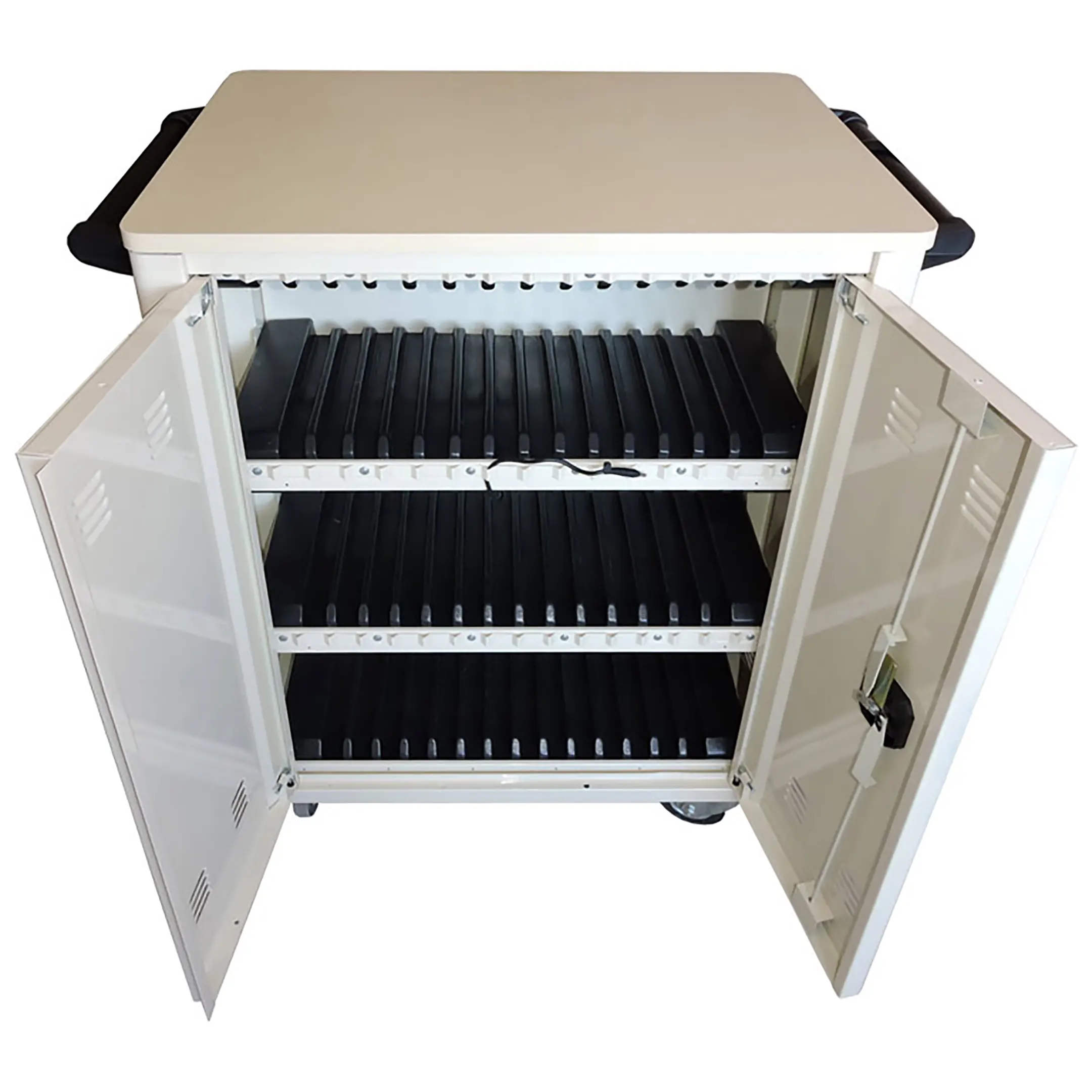 - Централизованная зарядка и хранение — позволяет одновременно заряжать все планшеты (обычно от 10 до 40 устройств) от одной розетки, благодаря интеллектуальной системе распределения питания, и хранить их в защищенных индивидуальных отсеках.