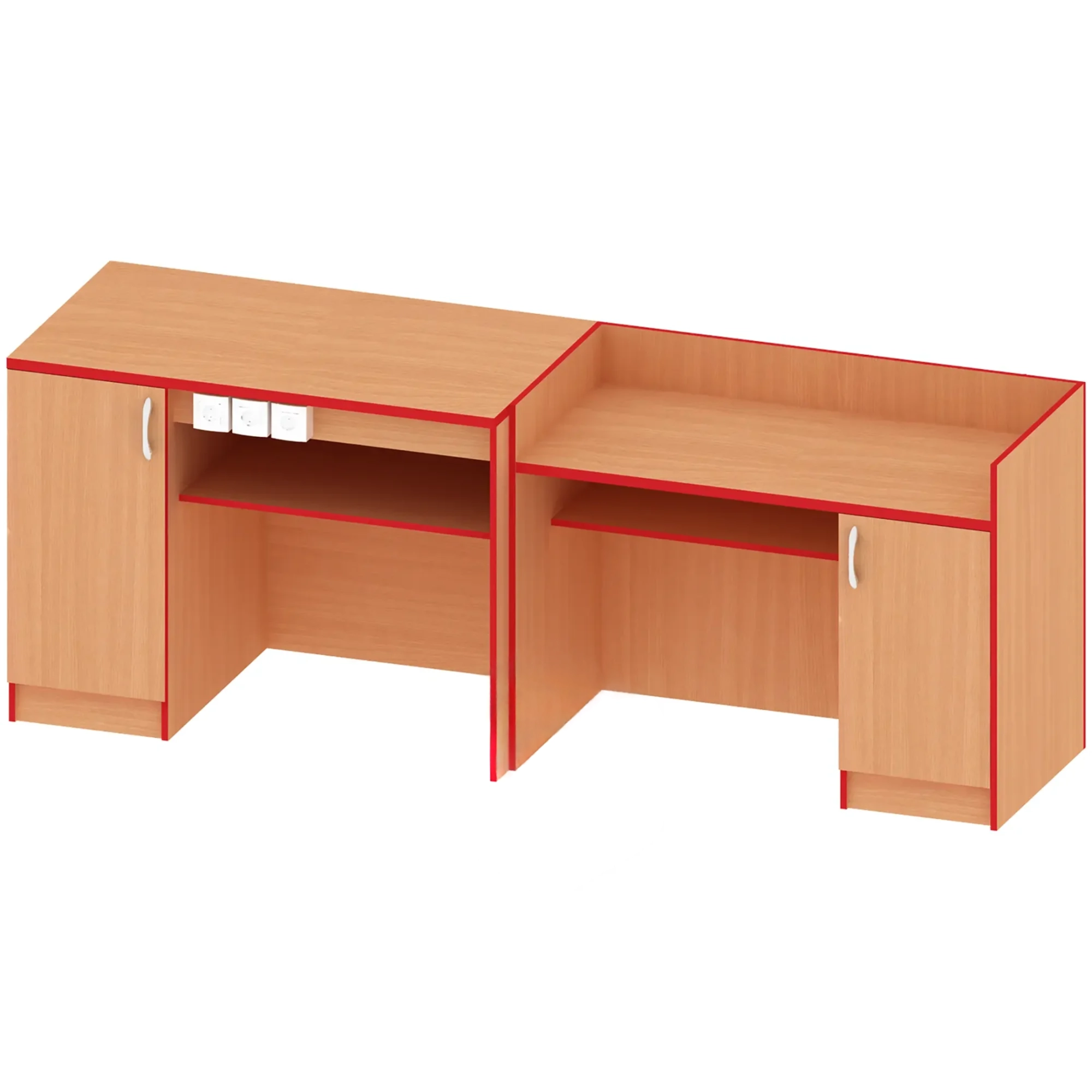 Стол демонстрационный для кабинета физики ПР-ТР-7-5 — это специализированное учебное оборудование, предназначенное для проведения демонстрационных экспериментов и практических занятий по физике в школах и других образовательных учреждениях. Модель имеет комбинированную конструкцию: одна половина предназначена для демонстраций, вторая — приставной стол для работы преподавателя. Стол оснащен тумбой с дверцей, открытой полкой и тремя розетками. Столешница покрыта пластиком. Изготовлен из качественной ЛДСП толщиной 16 мм.