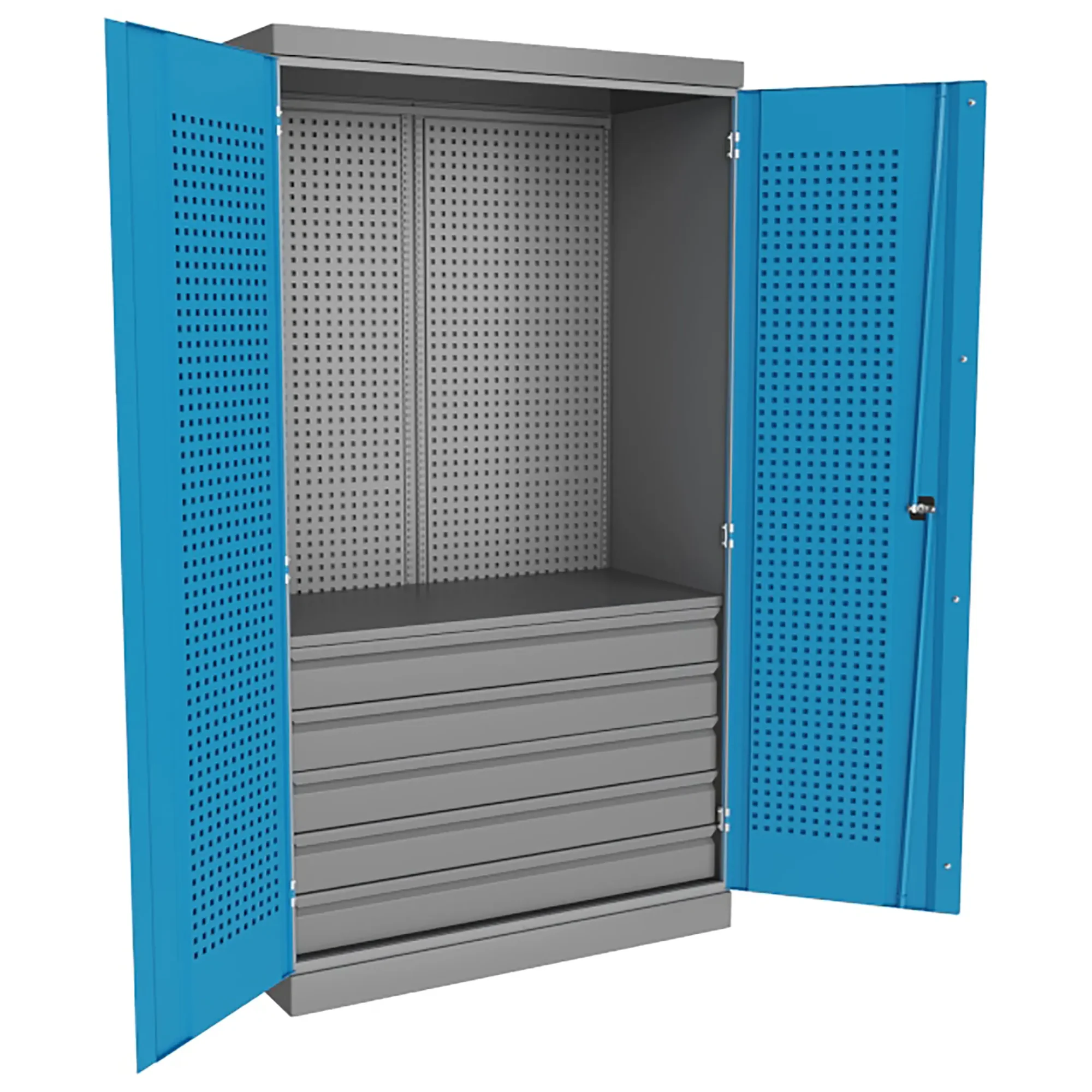 - Надежная защита инструментального парка — цельнометаллический корпус с запирающимися на общий замок дверями обеспечивает защиту содержимого от хищений и несанкционированного доступа. Закрытая конструкция также предохраняет инструмент от производственных загрязнений: пыли, стружки, масел и влаги, что особенно важно для сохранения точности измерительного оборудования.