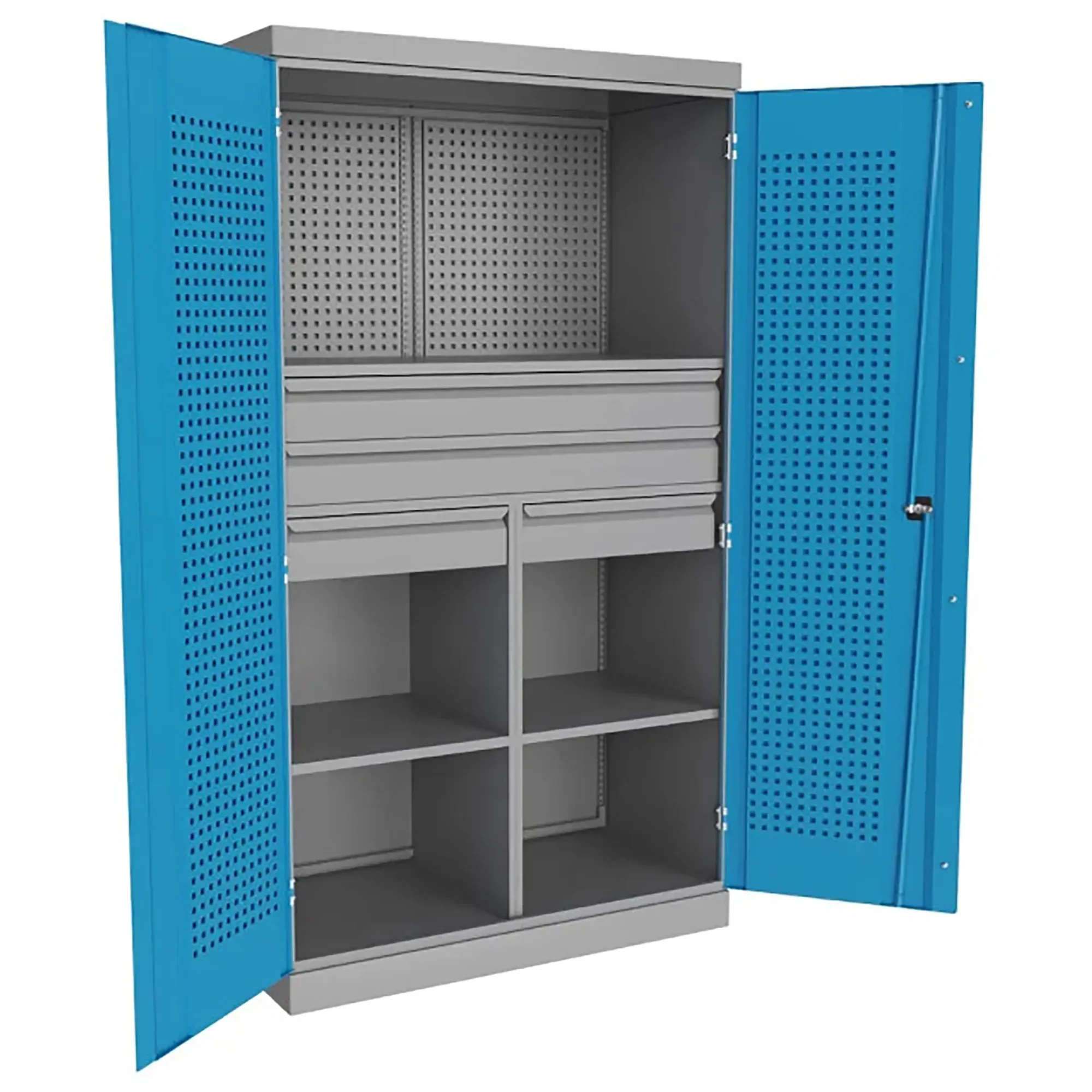 - Оптимизированная организация рабочего пространства — шкаф сочетает в себе различные типы систем хранения: запирающиеся отделения с полками для габаритного оборудования и набор выдвижных ящиков разной высоты для мелкого инструмента, метизов и приборов. Это позволяет рассортировать весь арсенал по типам и частоте использования, что экономит время на поиск и поддерживает идеальный порядок.