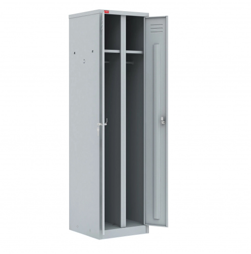 Шкаф разборный металлический двухсекционный, для хранения сменной одежды. В отделении - полка для головного убора, 2 крючка и перекладина для вешалки.