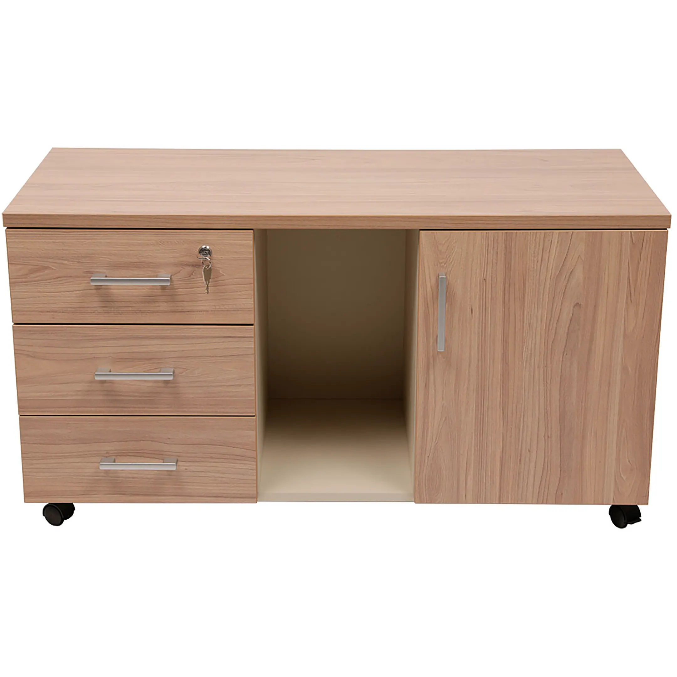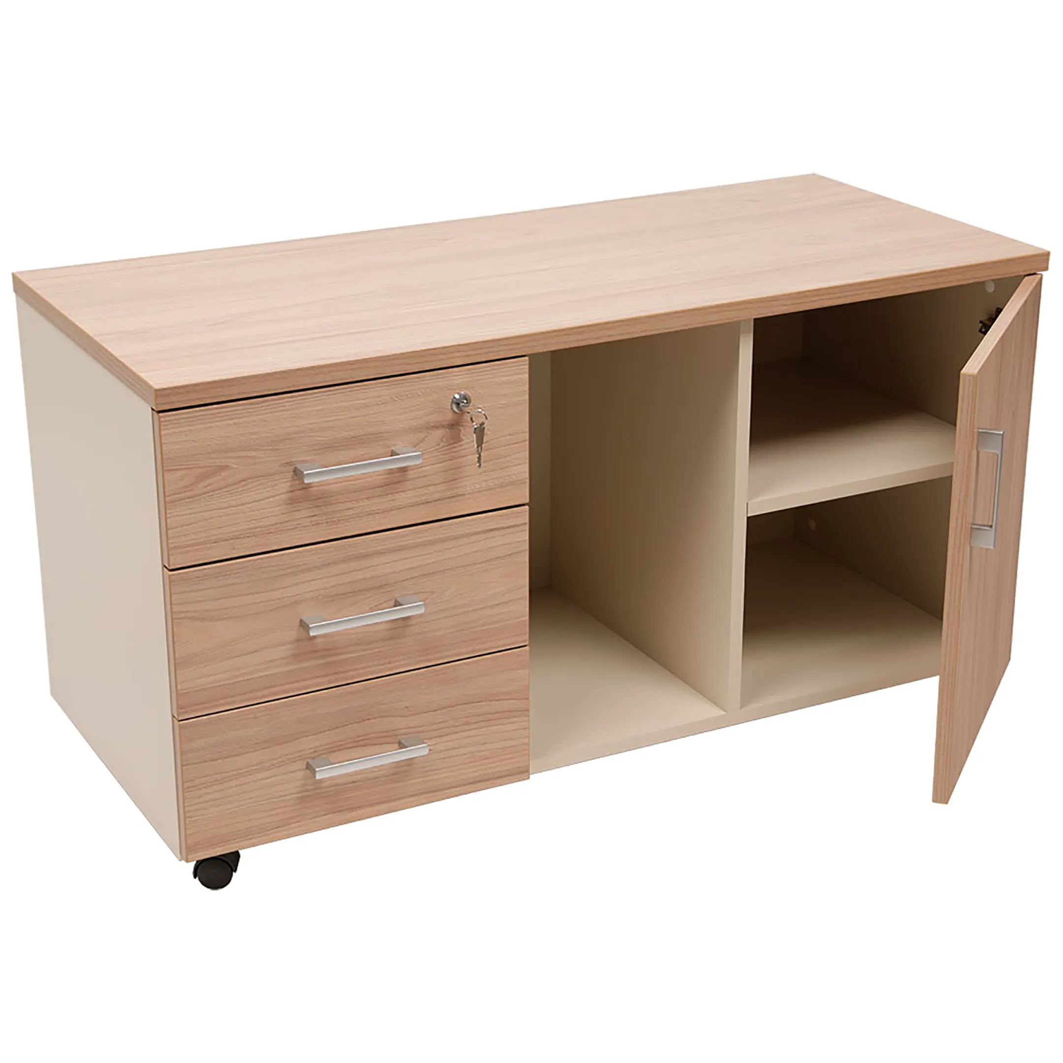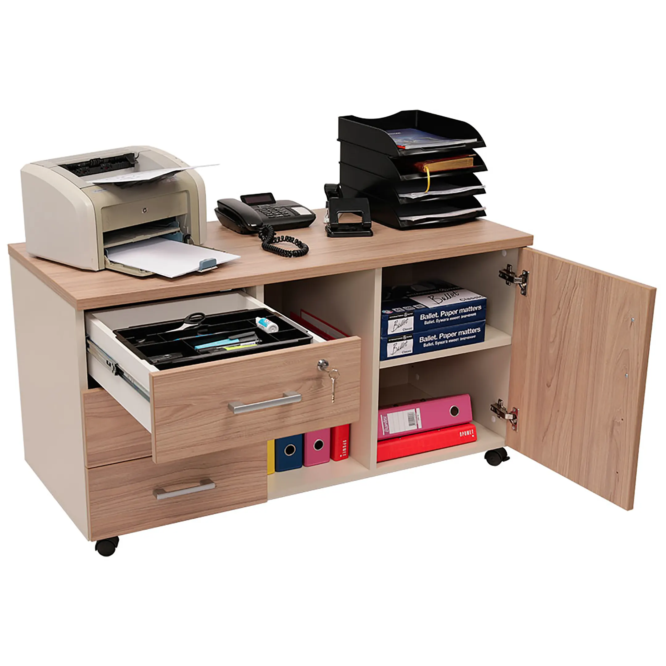 • верхний ящик тумбы снабжен замком и оснащен пластмассовым лотком для канцелярских принадлежностей;