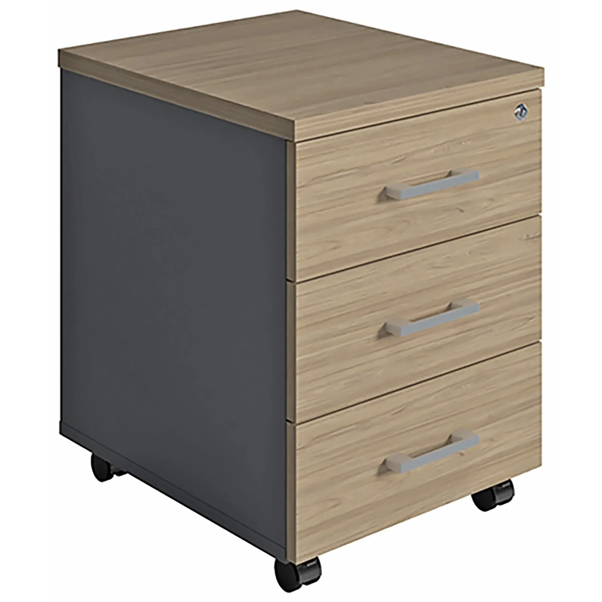 • тумба снабжена центральным замком и оснащена пластмассовым лотком для канцелярских принадлежностей в верхнем ящике