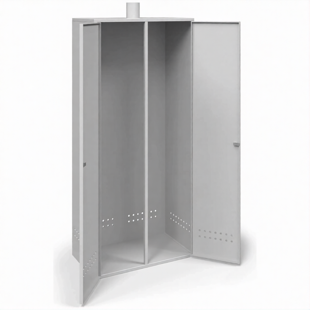 - Обеспечение требований пожарной безопасности — прочный металлический корпус служит эффективным барьером, изолирующим баллоны от возможных источников открытого огня, искр и тепла. Наличие системы приточно-вытяжной вентиляции (перфорация или вентиляционные решетки в верхней и нижней частях) обеспечивает постоянный воздухообмен, что критически важно для предотвращения образования взрывоопасной концентрации газа в случае утечки, в полном соответствии с ППР РФ.