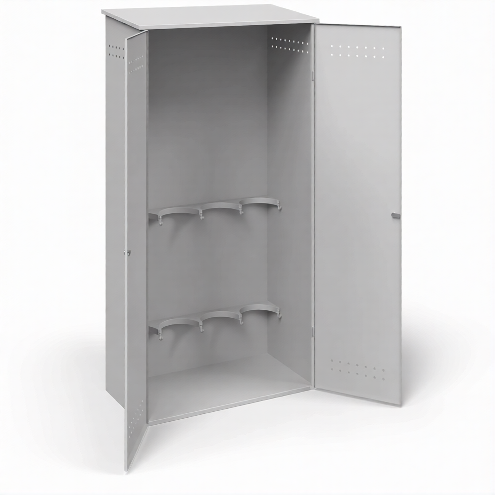 - Компактная вместимость для малых потребностей — шкаф идеально подходит для участков, где одновременно используется ограниченное количество газовых баллонов (например, для резки, сварки или лабораторных работ). Он позволяет безопасно хранить 4 стандартных баллона, экономя полезное пространство в цеху, гараже или техническом помещении, обеспечивая при этом полный контроль и порядок.