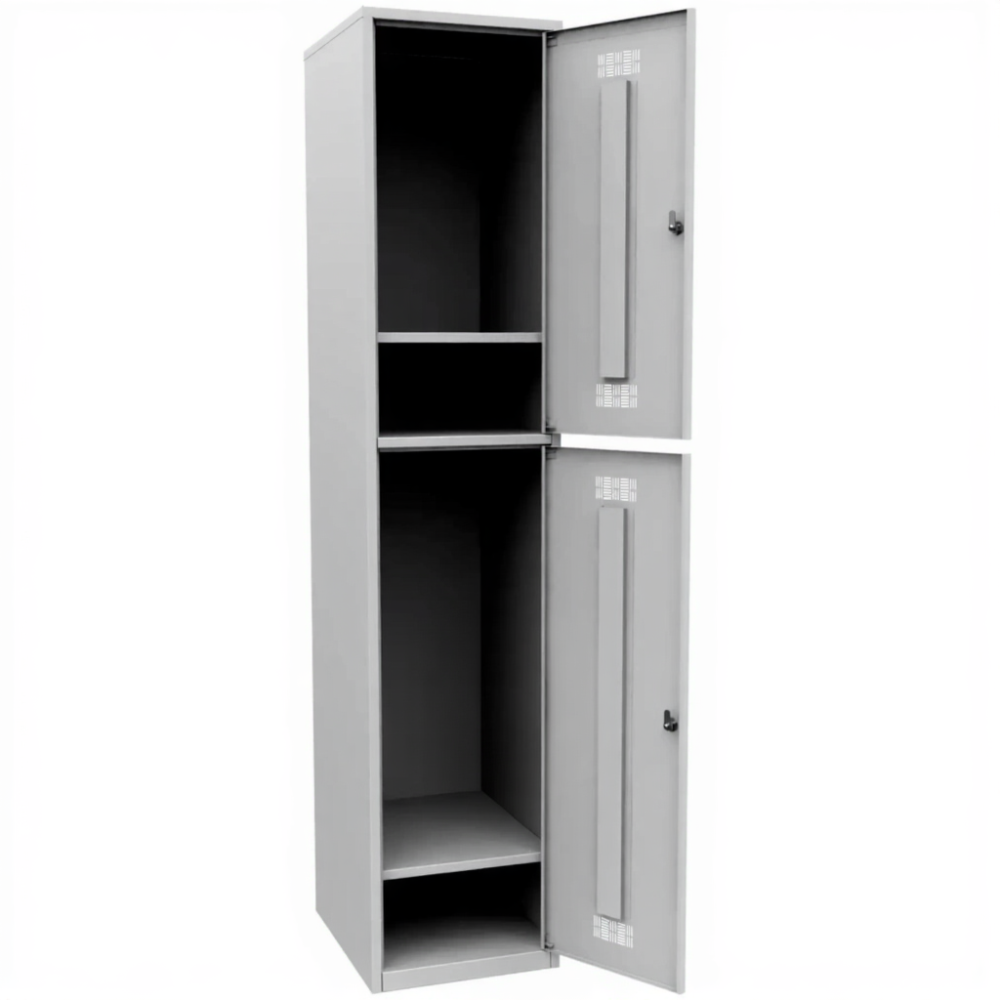 • Шкаф металлический для хранения одежды и обуви на 2 отделения с полками под обувь. Состоит из двух секций.