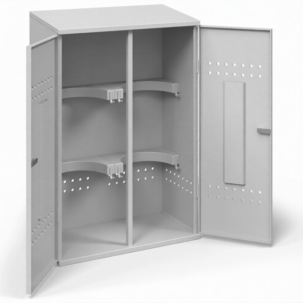 - Прочность и надежность конструкции — использование стали 1,2 мм и болтовых соединений обеспечивает достаточную жесткость и устойчивость собранного шкафа для безопасного размещения двух тяжелых баллонов. Конструкция рассчитана на длительную эксплуатацию.